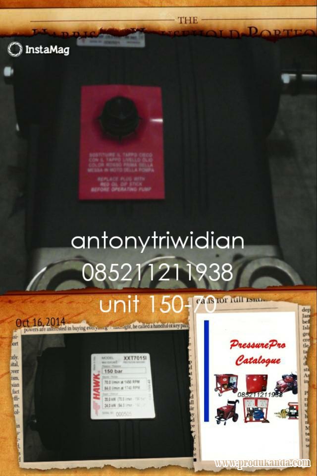 | Keterangan: | Pompa Hydrotest Tekanan 150 Bar/ 2175 Psi. Pompa Hawk XXT 7015 I. 150 Bar , 2175 Psi , 70L/ M , 20Kw. Email antonytriwidian@yahoo.com |
